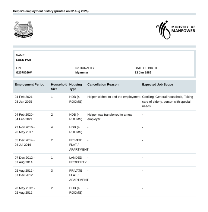 - Reason for leaving: Helper grandmother passed away and went back Myanmar