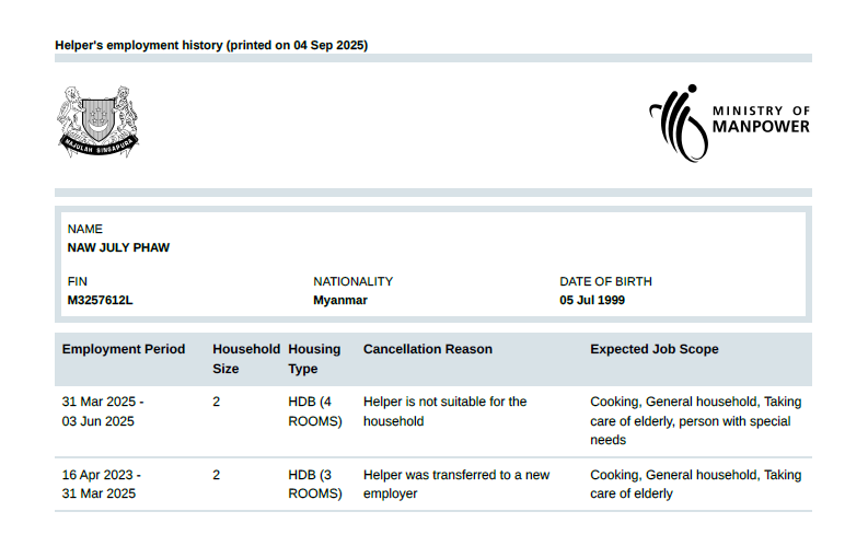 'NAW JULY PHAW, from Myanmar, has experience in general household work such as cleaning, laundry, ironing, etc. They are responsible, confident, and trustworthy. They speak English and are good with both children and the elderly.'