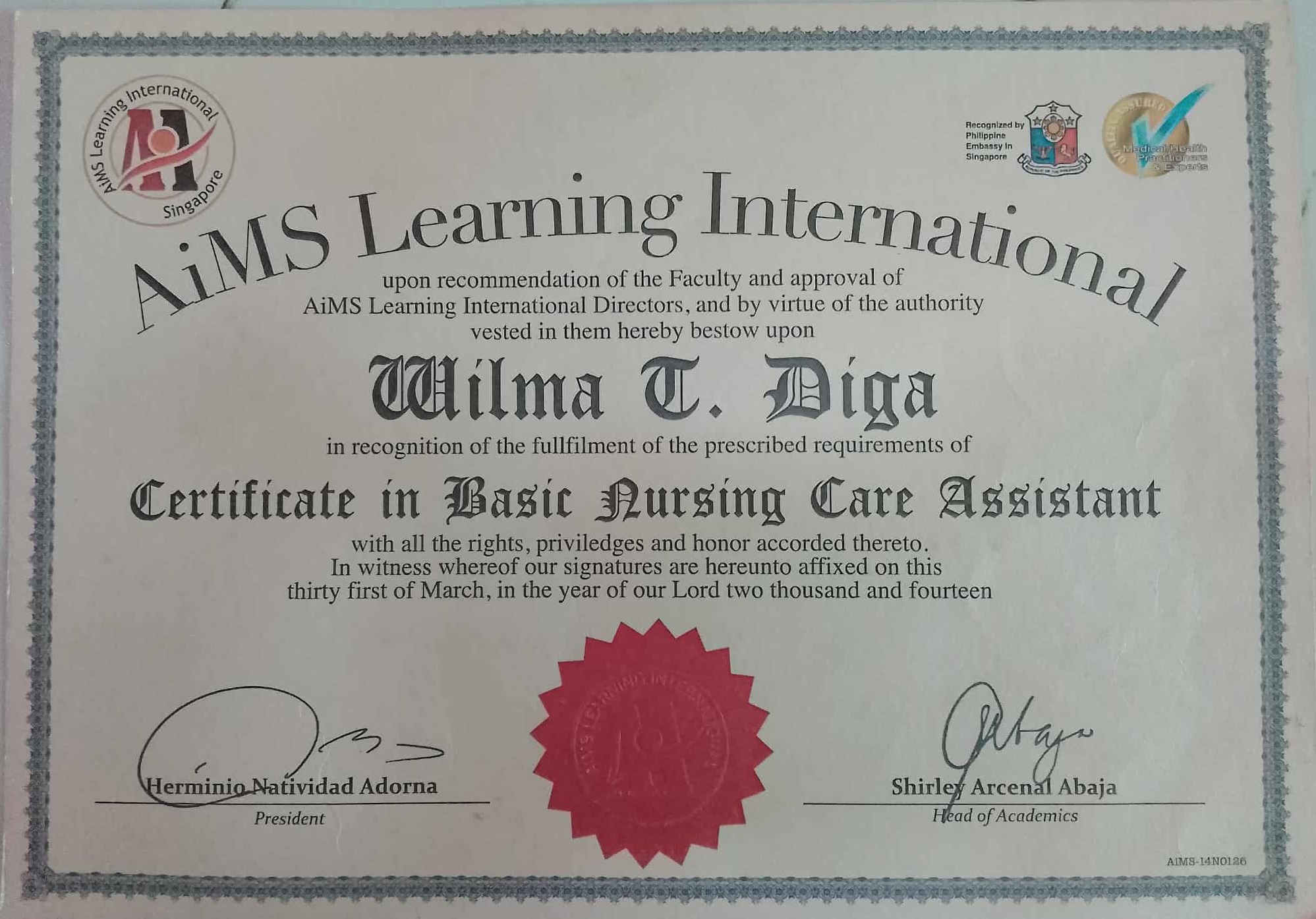 'DIGA WILMA TABING, from Philippines, has experience in general household work such as cleaning, laundry, ironing, etc. They are responsible, confident, and trustworthy. They speak English and are good with both children and the elderly.'