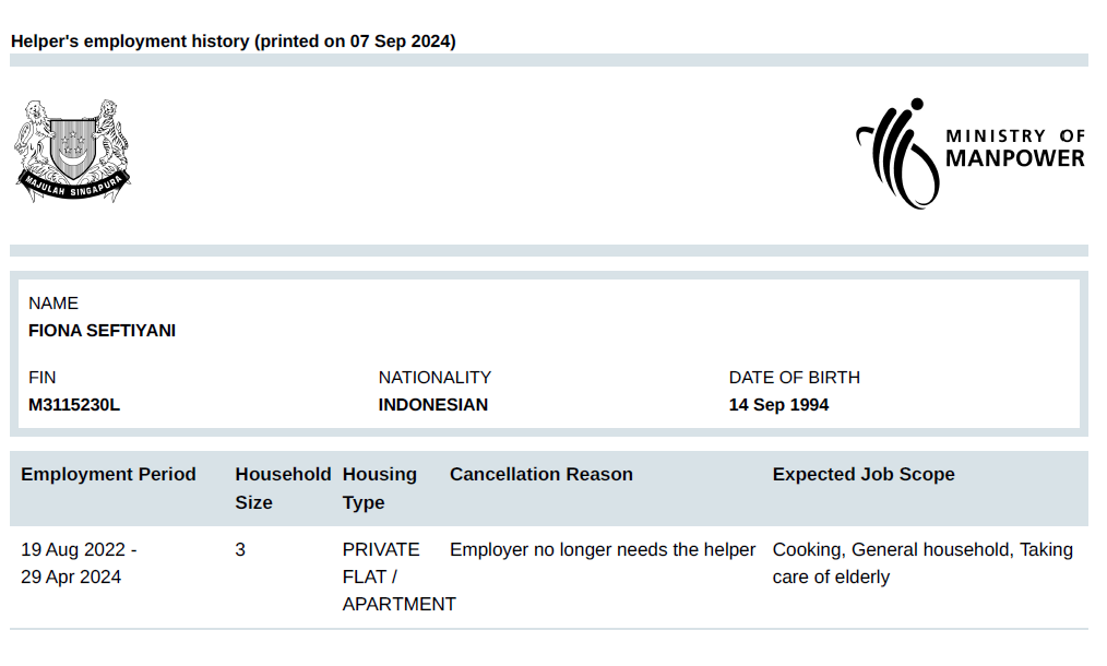 • Reason for leaving: Both elderly passed away and employer no longer needs the helper.