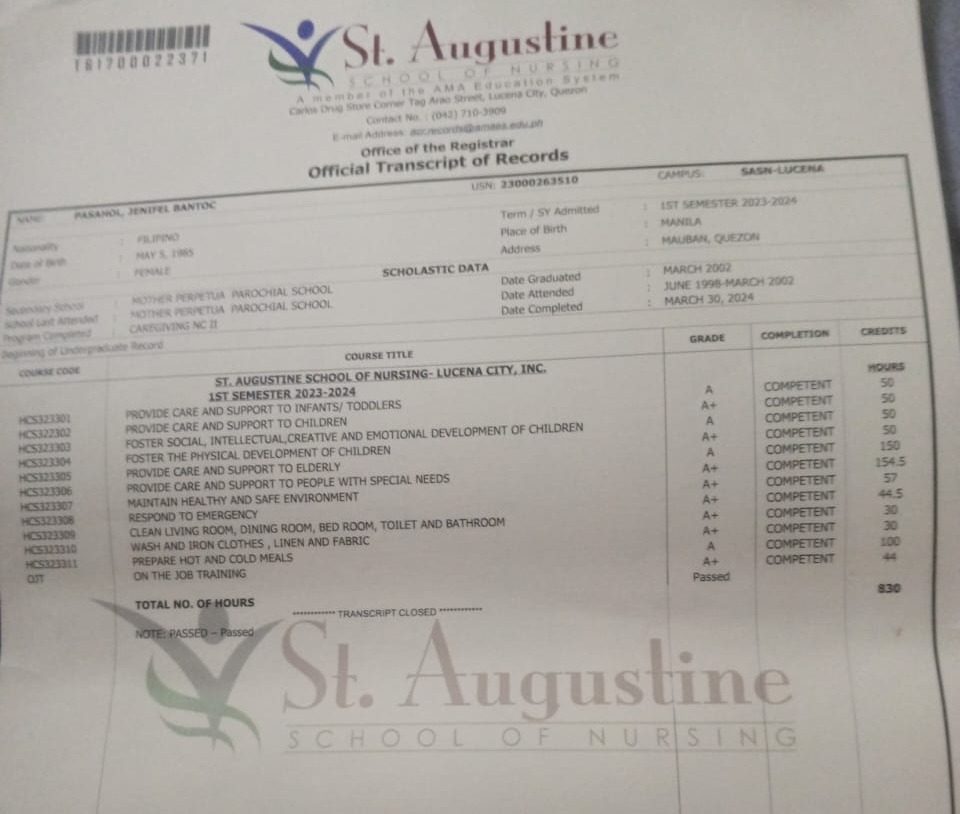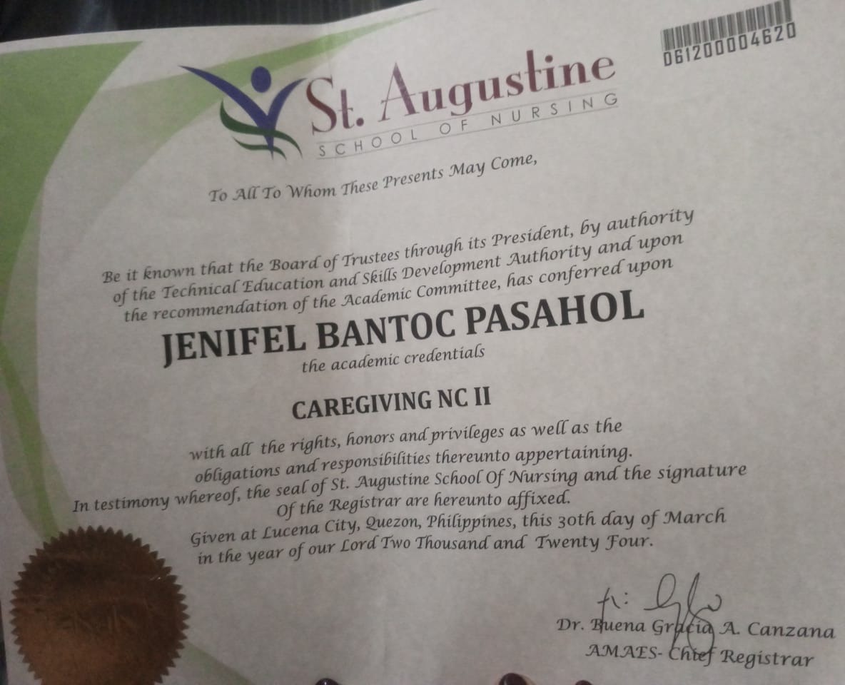 Special Mention She has health care services and caregiving certificate in the Philippines