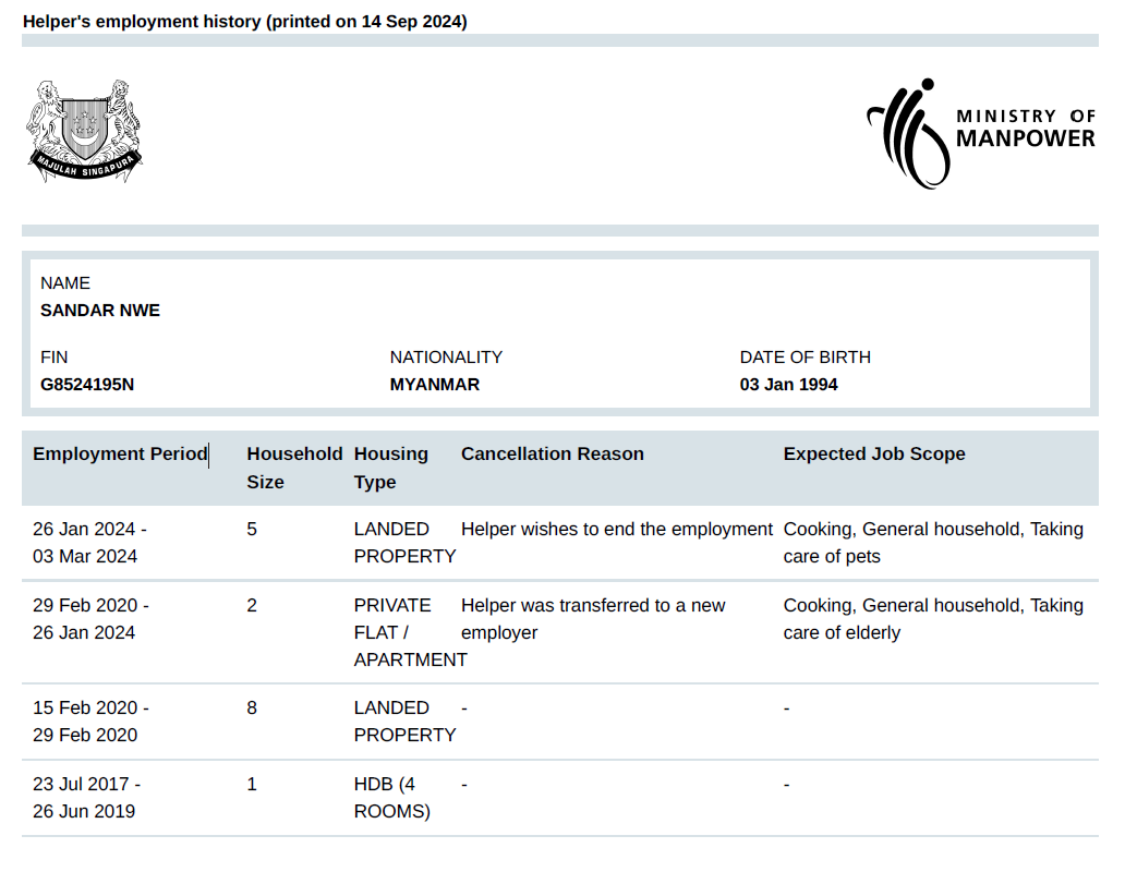 - Reason for leaving: She cannot handles 3 dogs and 4 years never go back Myanmar so employer let her go back as well.