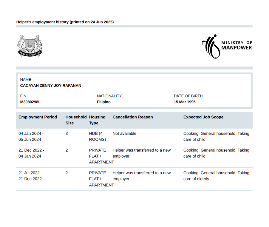 - Reason for leaving: MOM caught that she's not working on the employer stated on the work permit