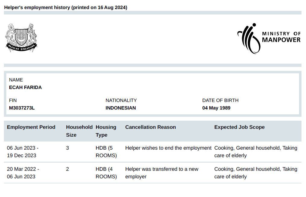 • Reason for leaving: AH MA PASSED AWAY AND SHE TRANSFERRED TO AH MA'S SON (SECOND EMPLOYER)