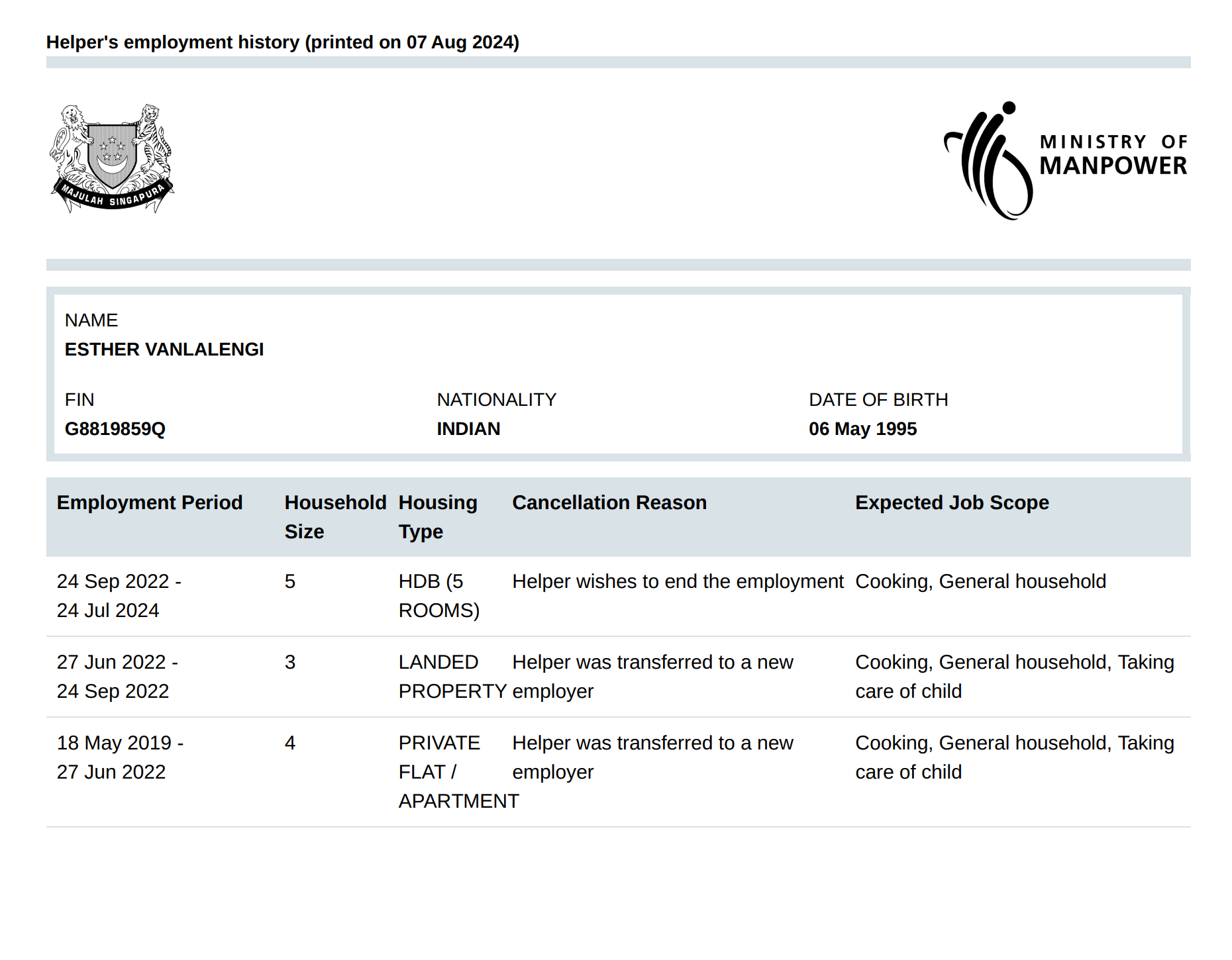 'ESTHER VANLALENGI, from India, has experience in general household work such as cleaning, laundry, ironing, etc. They are responsible, confident, and trustworthy. They speak English and are good with both children and the elderly.'