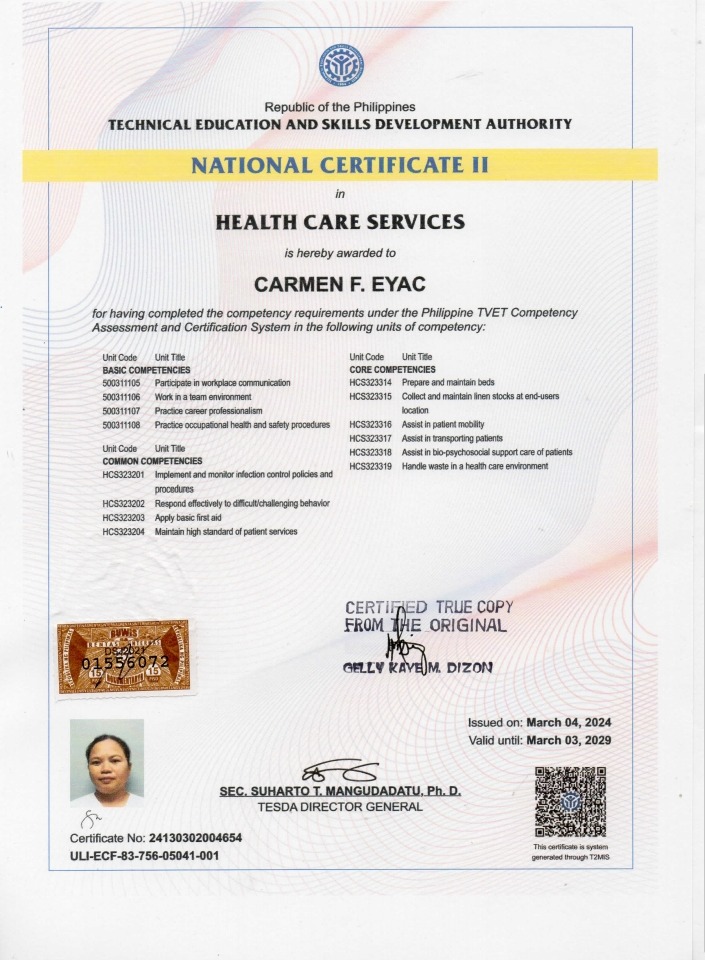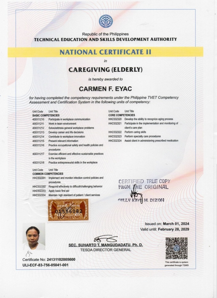 | Special Mention | She has Caregiving (Elderly) and Health Care Services Certificates from the Philippines. She said that she likes to cook and interested to learn any kind of dish. |