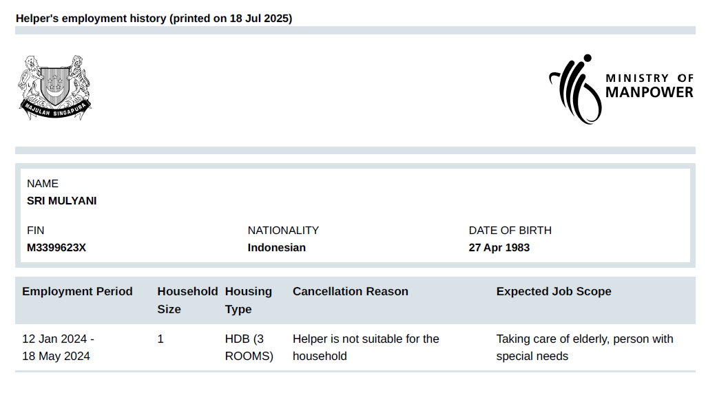 • Reason for leaving: Ah ma's son took her to China for treatment so they release helper for good